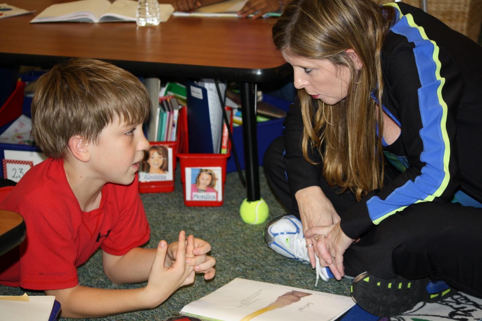 | Mrs.McBride stopped in for some conferencing about mood in poetry. |